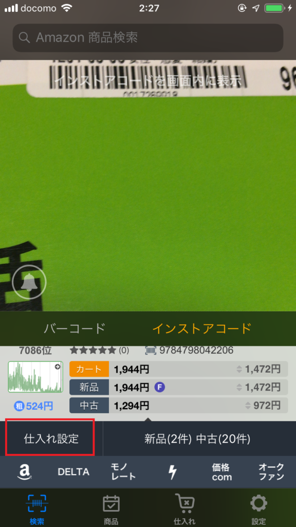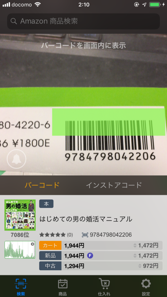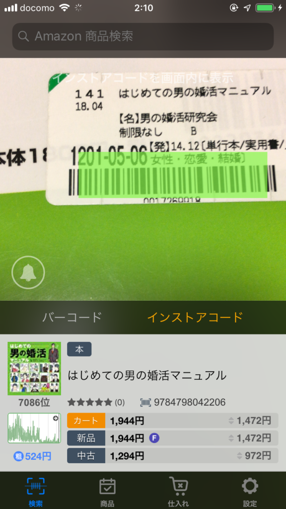 商品のバーコードをあてると下にその商品の詳細と現在Amazonで発売されている「最低価格」が表示されます。まずはこの価格を見て仕入れ対象かどうかを判断します。
