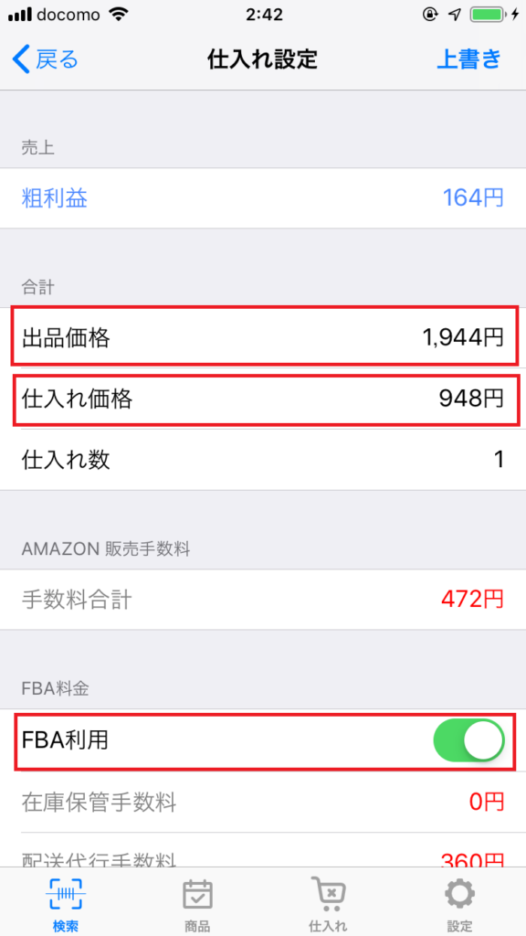 | ・出品価格:販売予定価格を入力 ・仕入れ価格:仕入れた価格を入力 ・FBA利用:ONを設定 |