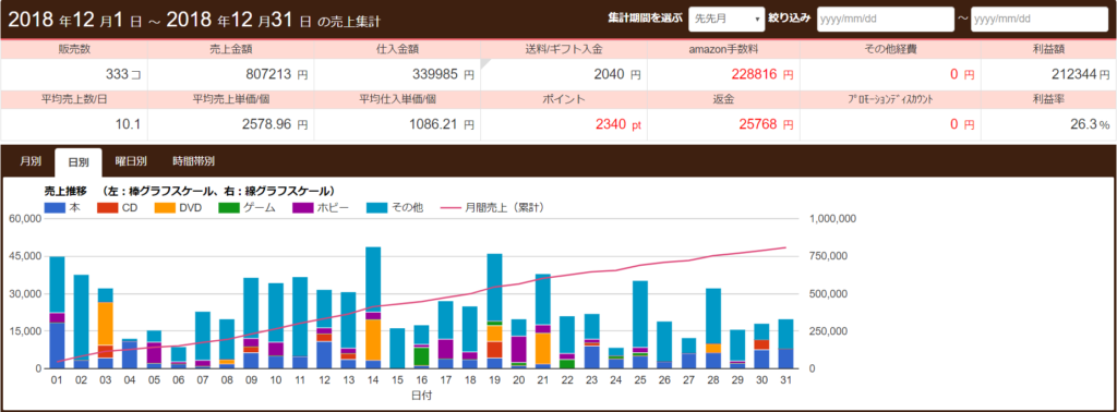 | 売上期間:2019年12月1日〜12月31日 販売数:333個 売上金額:807213円 仕入れ金額:212344円 amazon手数料:228816円 利益:212344円 |