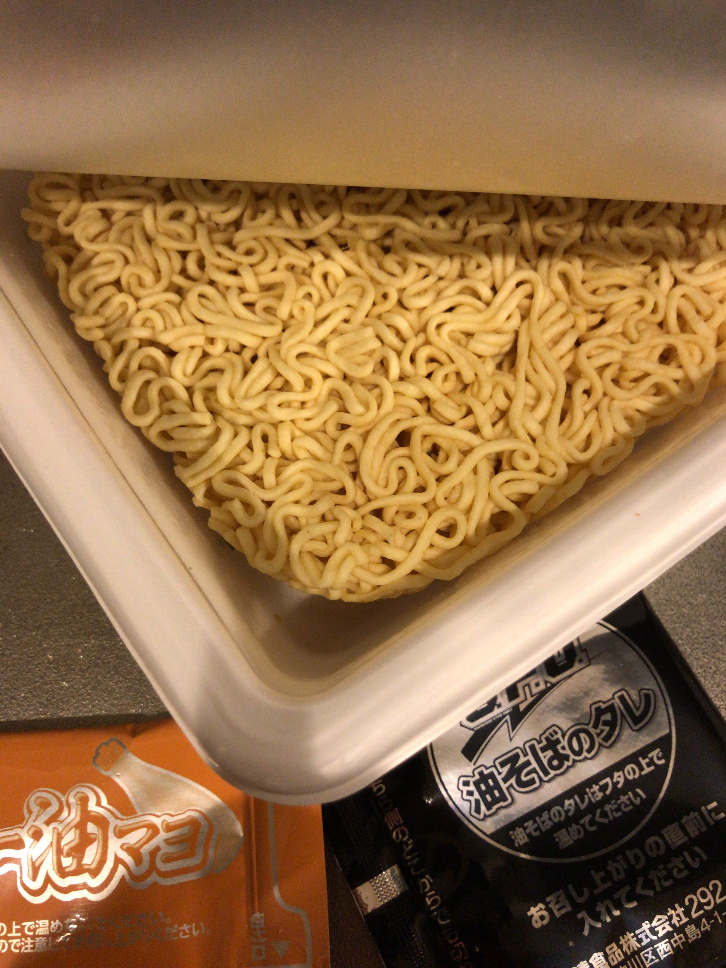 一般的な「焼きそば」と同じ作り方ですね。中身を空けると「油そばのたれ」と「ラー油マヨ」が出てきます。