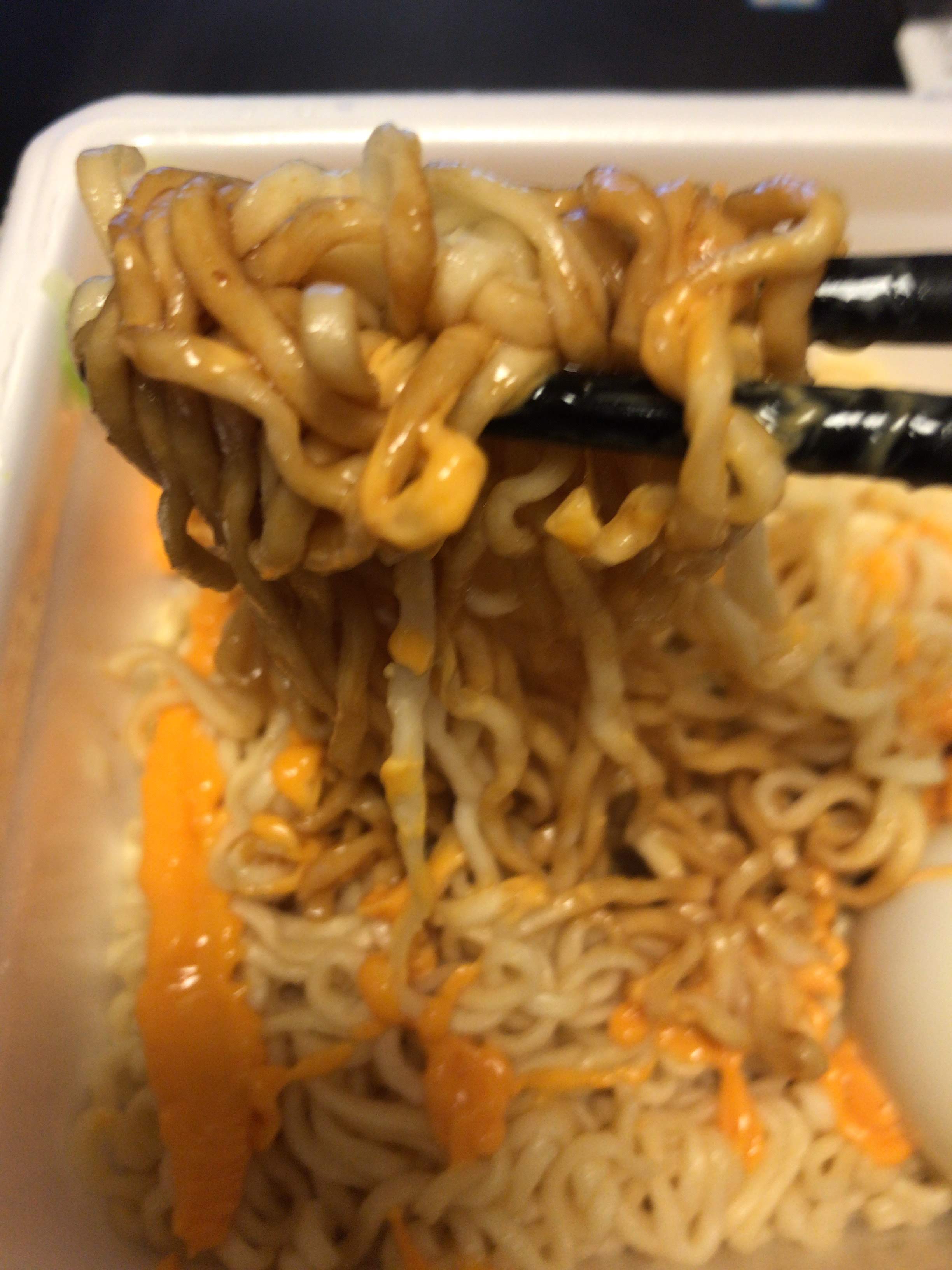 「コシのある中太ちぢれ麺」と説明にあったように確かにコシはあるのですが、焼きそばタイプで5分待ちというのもありやや伸びた感は否めません。個人的には3分ぐらいでちょうどよかったんじゃないかという感想です。