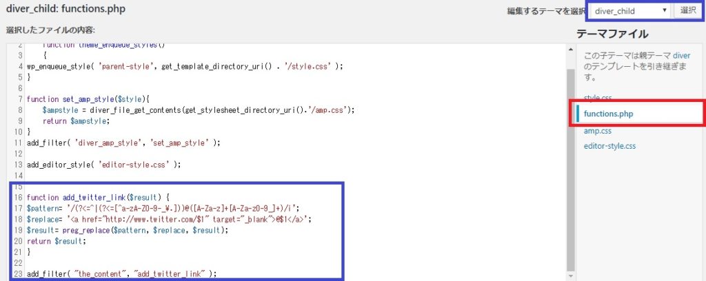 diverの場合には、「diver_child」の中に「function.php」があるため、「diver_child」を選択します。