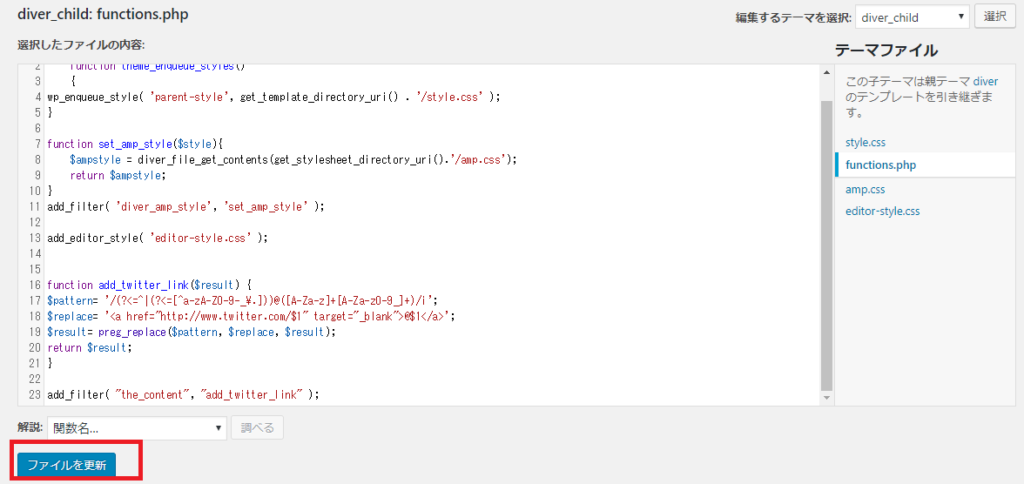 phpファイルに、コードを追加したら下にある「ファイルを更新」ボタンを押下します。