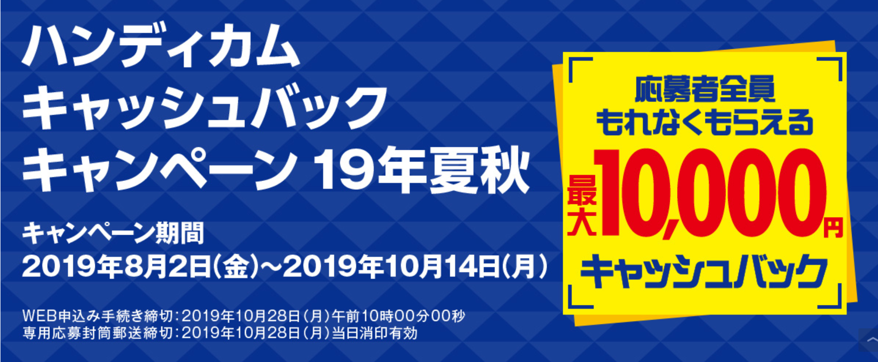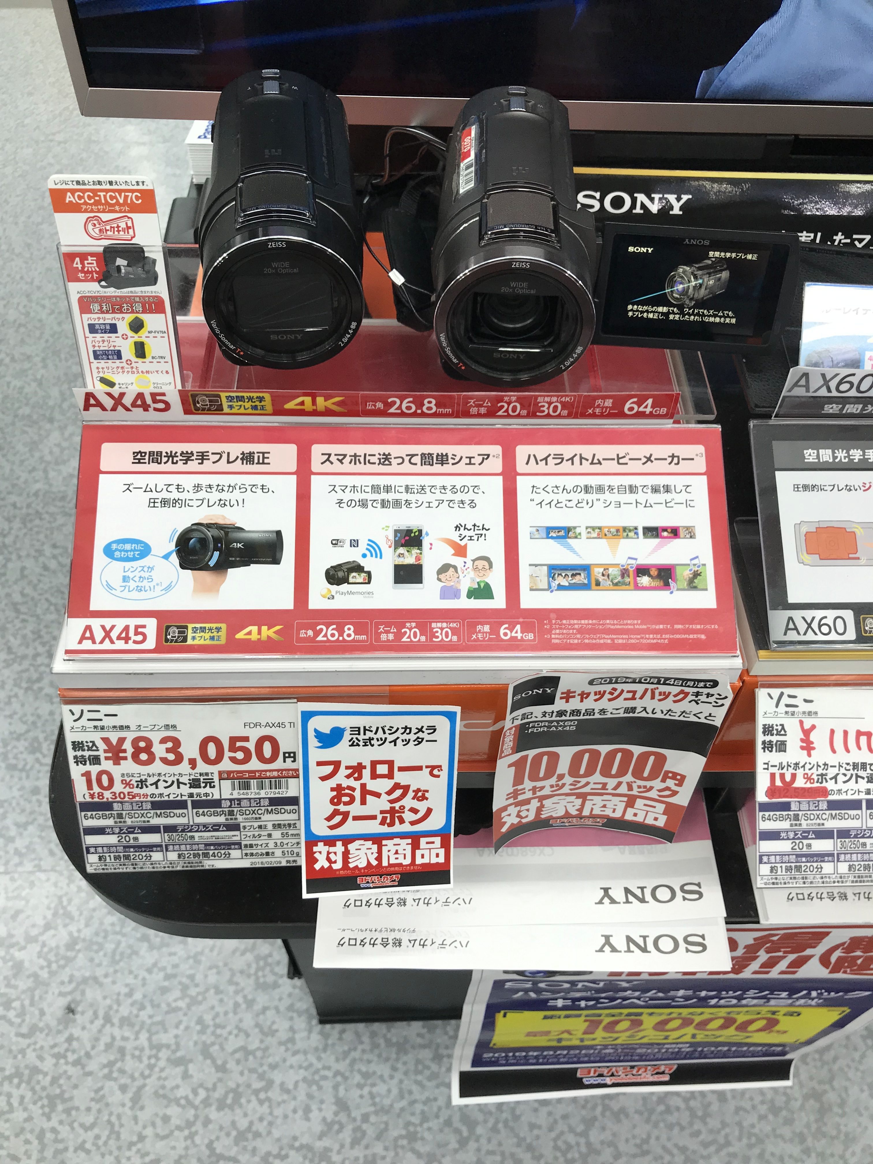実は、今SONYのキャンペーンキャンペーンを実施しており、こちらの「FDR-AX45」を購入すると、なんと10000円もキャッシュバックされるのです。2019年10月14日までなのでお見逃しなく。
