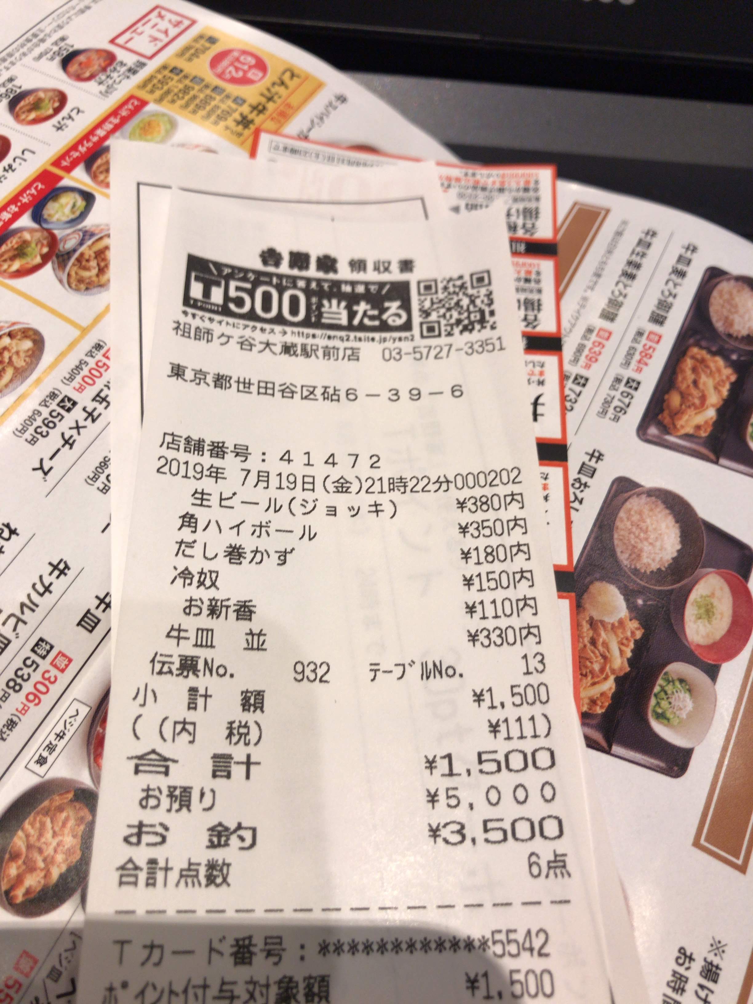 | 生ビールジョッキ:380円 だし巻かず:180円 冷奴:150円 お新香:110円 牛皿:330円 角ハイボール:350円 合計1500円(税込) |